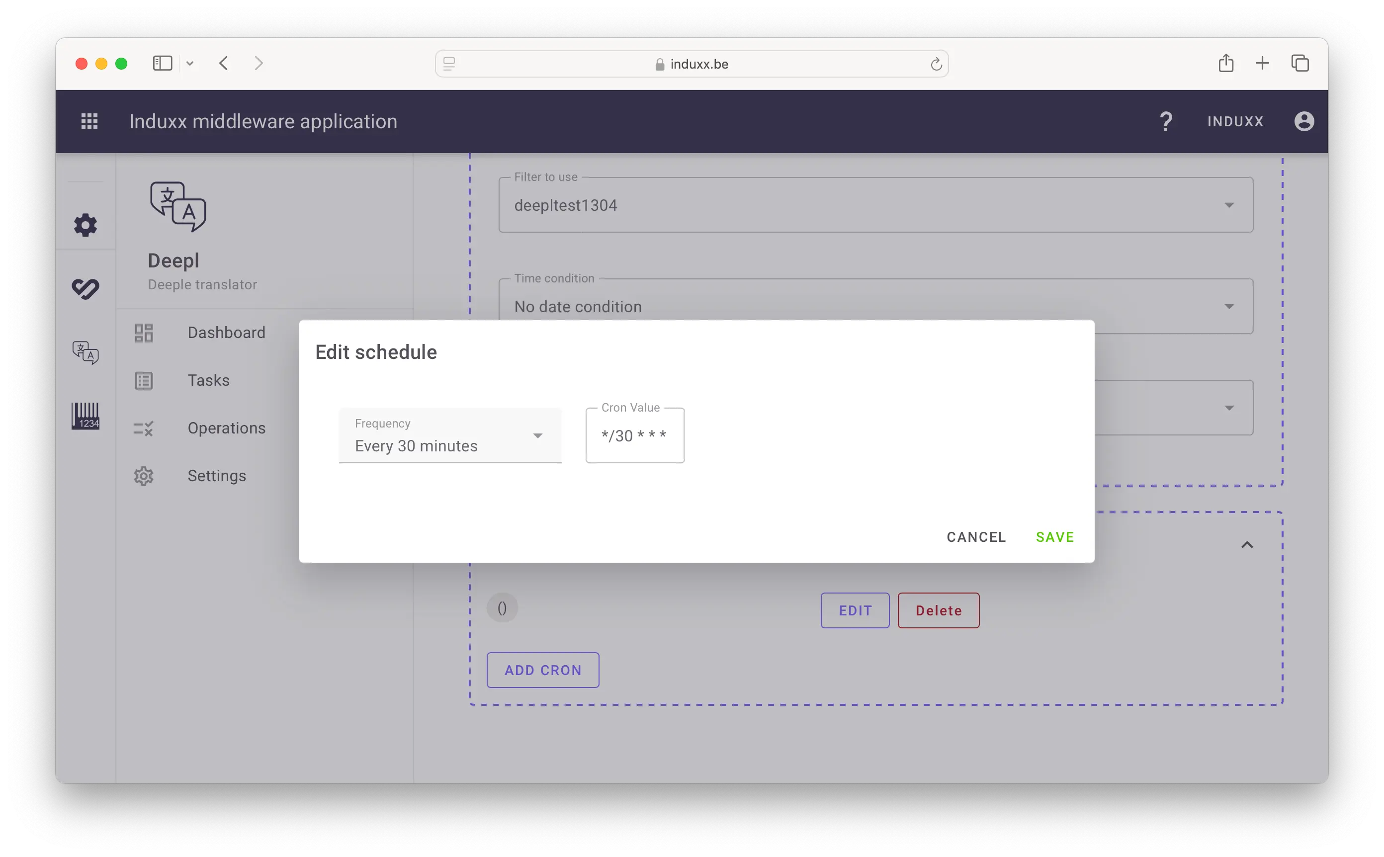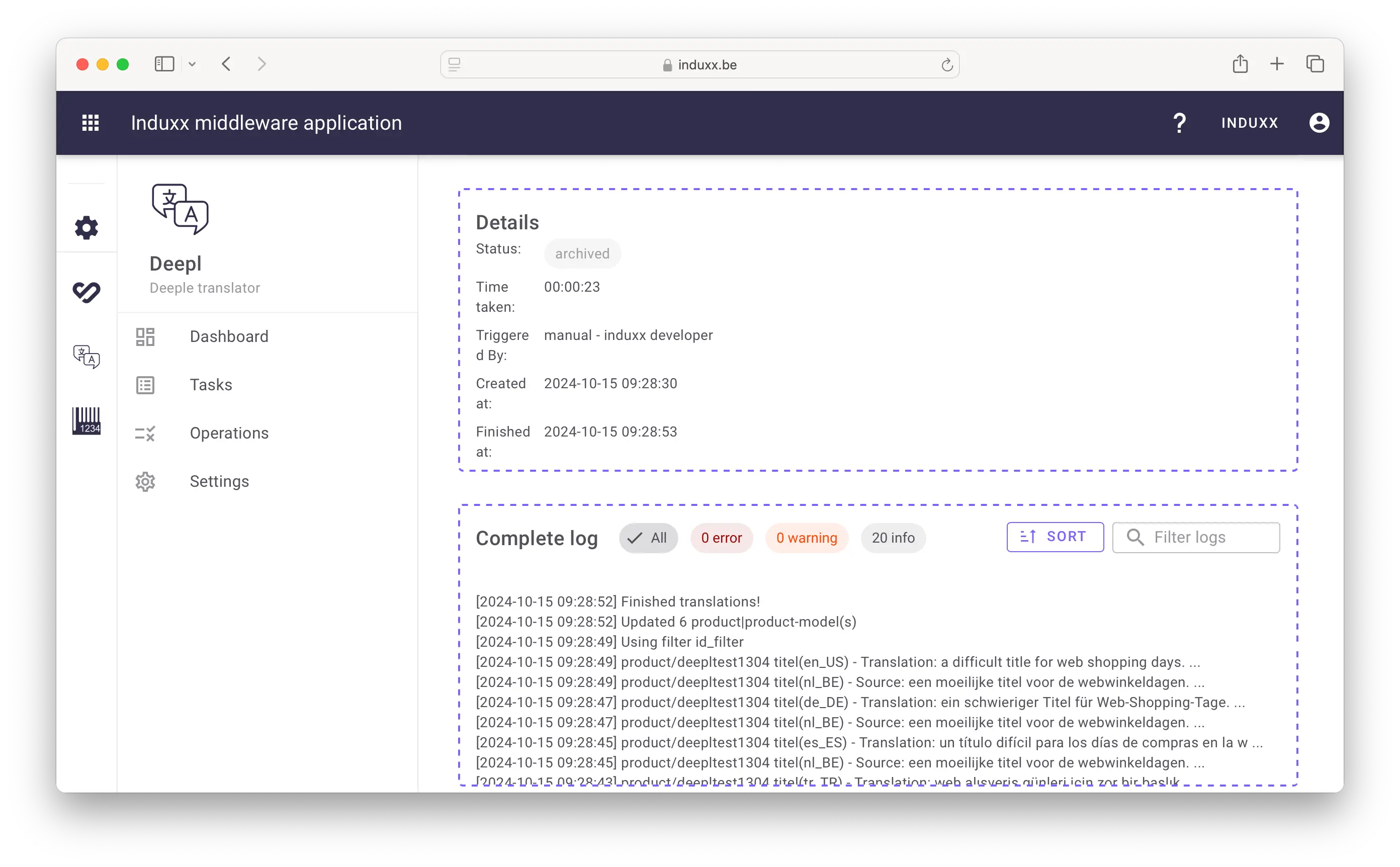In de interface kun je één of meerdere taken aanmaken. Elke taak bevat een aantal instructies: wat je wilt vertalen, welke talen van toepassing zijn, en optioneel een interval. Hiermee kan een taak automatisch achter de schermen de ontbrekende vertalingen in jouw PIM aanvullen. Bij het uitvoeren van de taak zorgt de DeepL API voor nauwkeurige vertalingen.