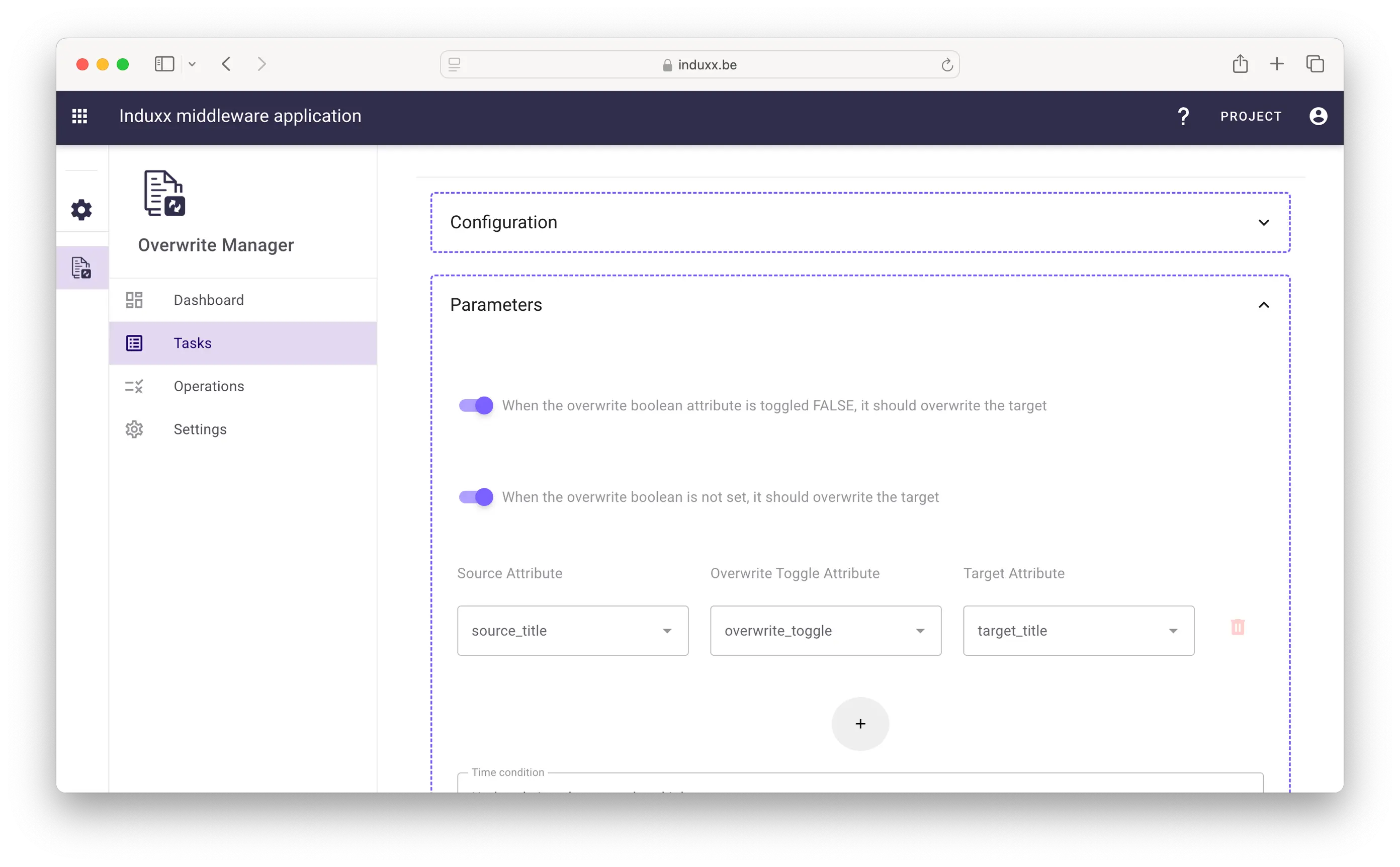 In de interface kun je één of meerdere taken aanmaken. Elke taak bevat een bronattribuut, een doelattribuut en een ja/nee-attribuut dat bepaalt of het doelattribuut gesynchroniseerd blijft met de bron. Op basis van deze configuratie wordt vastgesteld welke attributen bij welke producten in sync blijven.